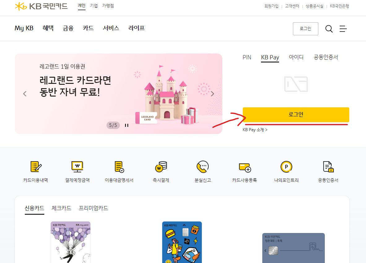 2022년 7월 기준으로 현재 4가지 방법으로 국민카드 홈페이지에 로그인할 수 있습니다.저는 KB Pay방법을 사용했습니다.