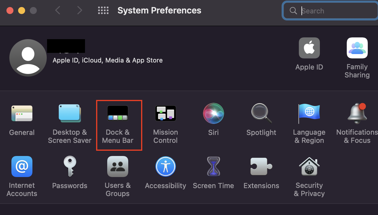 1️⃣ 설정창에서 [Dock & Menu Bar]를 클릭합니다.