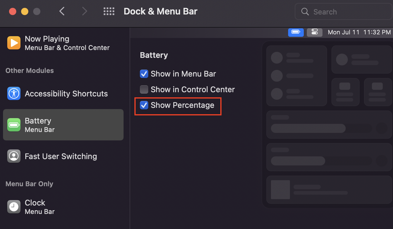 2️⃣ [Battery]메뉴를 클릭하고 [Show Percentage]체크박스를 선택합니다.