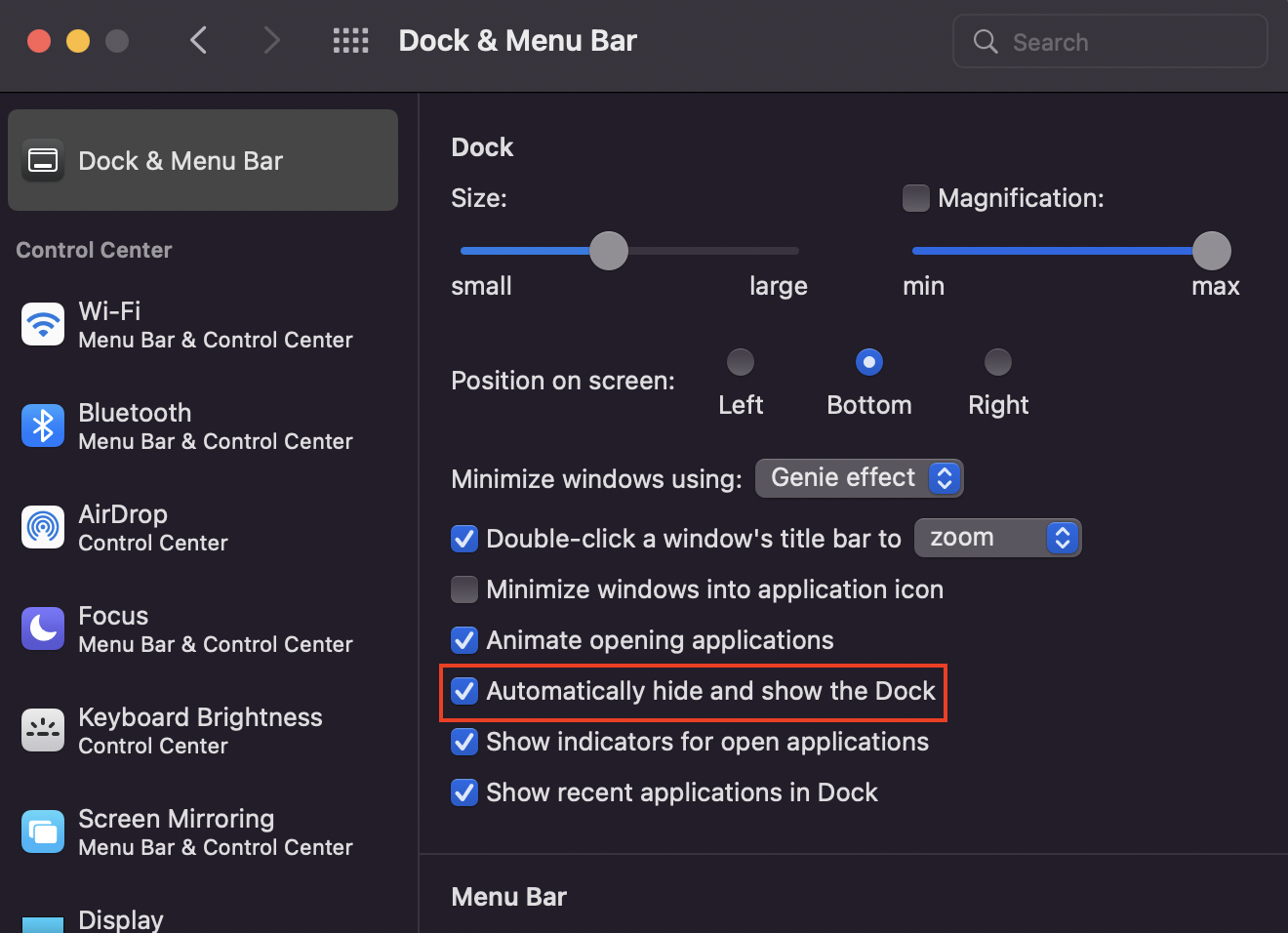 2️⃣ [Automatically hide and show the Dock]체크박스를 선택합니다.