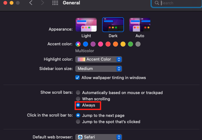 2️⃣ [show scroll bars]를 Alwyas로 선택합니다.