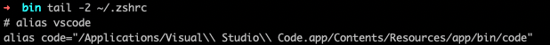 alias code="/Applications/Visual\\ Studio\\ Code.app/Contents/Resources/app/bin/code"