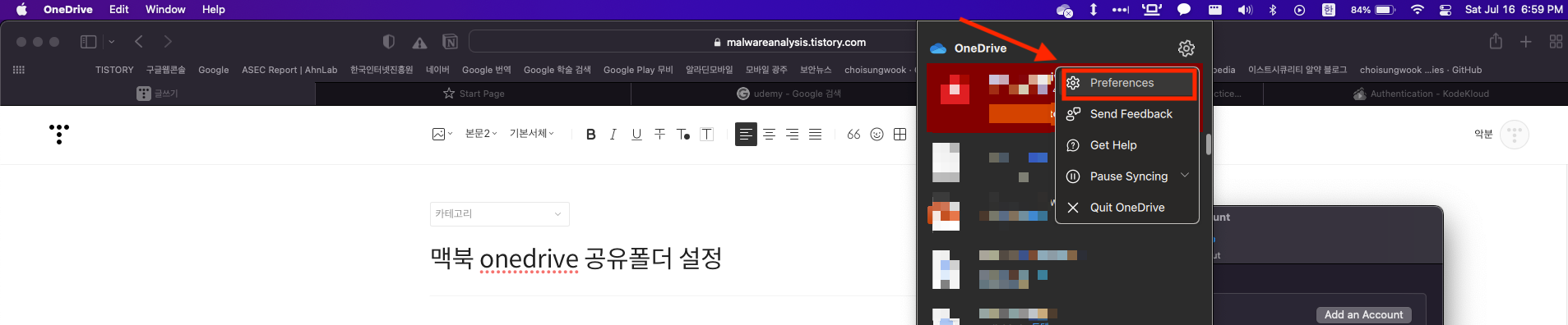 1️⃣ 상태바 오른쪽 위에 onedrive아이콘을 찾습니다.