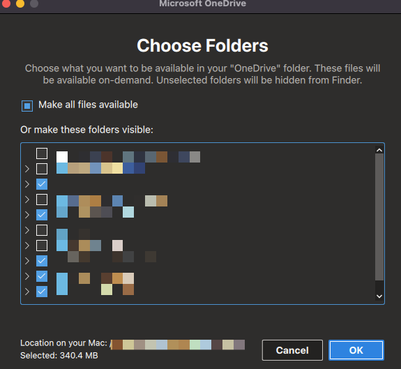 ondrive를 설치하면 기본설정으로 onedrive의 모든 파일과 폴더를 공유합니다. 맥북의 저장디스크 공간이 여유가 있다면 상관없지만, 없다면 공유하고 싶은 폴더만 설정하는 것이 좋습니다.