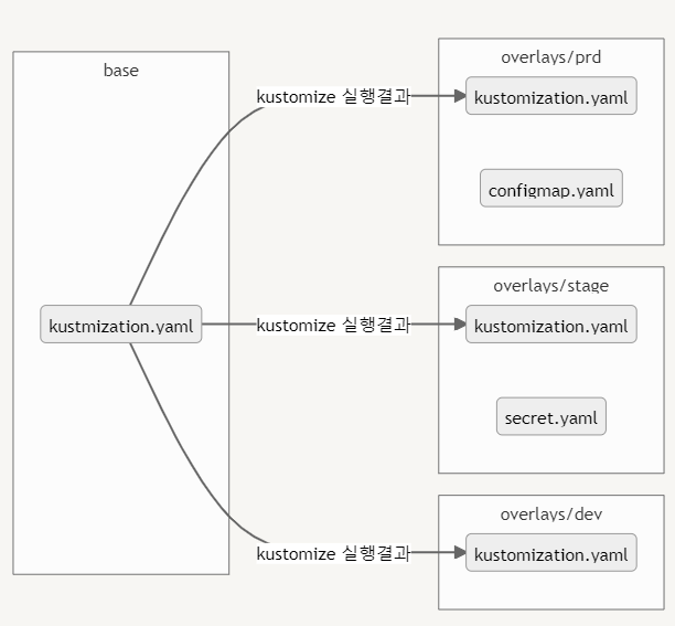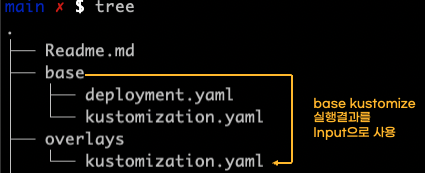 kustomize 실행결과를 다른 곳에서 불러서 사용하는 것을 Base/Overlays라고 합니다. 마치 kustomize로 템플릿을 만들고 템플릿 실행결과를 다른 곳에 kustomize로 사용하는 방법입니다.