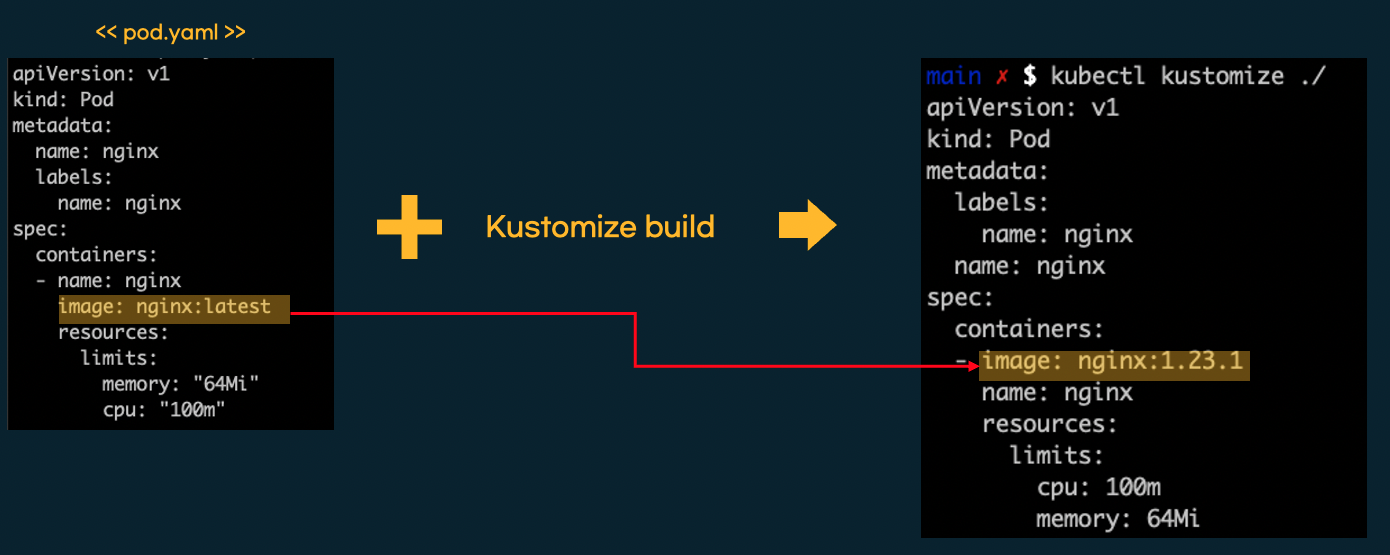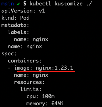 생성된 pod의 이미지를 확인하면 nginx:1.23.1입니다. pod.yaml은 latest이지만 kustomize가 1.23.1로 변경했으므로 최종단계에서는 nginx:1.23.1로 적용되었습니다.