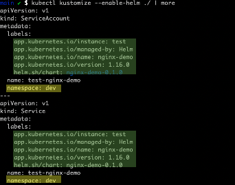 내부 동작은 helm pull → helm template → kustoimze 순서로 실행되는 것 같아요. 즉, helm 명령어가 먼저 실행되고 kustomize를 실행하기 때문에 helm에서 설정한 일부 필드가 kustomize단계에서 재정의될수 있습니다. 위의 예제에서는 releaseNamespace에 설정한 namespace가 적용되지 않습니다. 사실, kustomize namespace를 제거해도 helm post render?문제 때문에 적용되지 않습니다. 이 문제는 github issue에 등록되어 해결하는 중인 것 같습니다.
