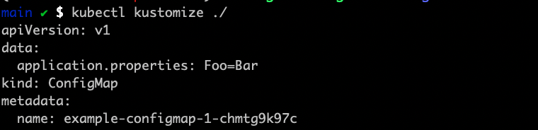 kubectl kustomize명령어를 사용하면 configmap리소스 정의가 화면에 출력됩니다. 재밌는 점은 metadata.name이름 뒤에 랜덤값이 붙습니다.