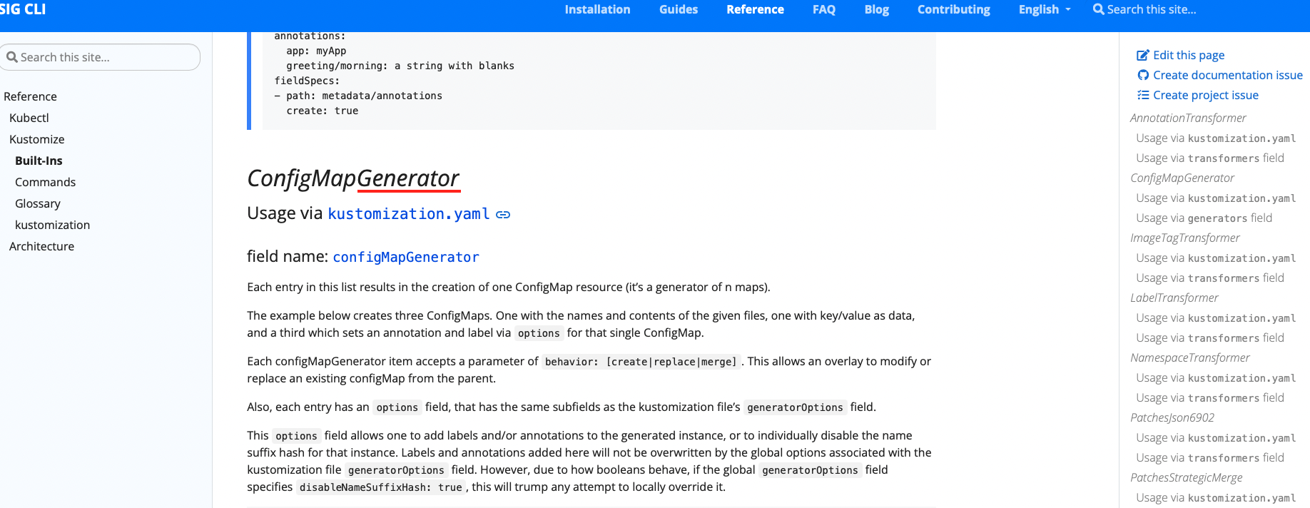 kustomization.yaml 필드는 플러그인으로 구성됩니다. 사용자는 built-ins(내장) 플러그인을 찾아 기능을 구현하고 원하는 플러그인이 없다면 직접 개발해서 사용할 수 있습니다. kustomize의 아쉬운 점은 공식문서가 여기저기 흟어져 있습니다. github와 홈페이지, 쿠버네티스 문서를 찾아 built-ins플러그인을 찾아야 합니다.