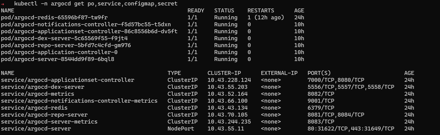 argocd 컴퍼넌트와 DB(redis)가 pod로 실행됩니다. 이 외에 serviceaccount, role, rolebinding 등이 있습니다.