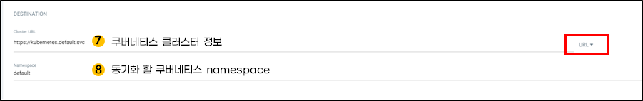 그 다음, 어디 쿠버네티스 클러스터에 동기화 할지 클러스터 정보를 입력합니다. 예제에서는 default namespace를 선택했습니다.