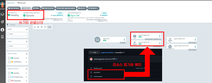 동기화가 완료되면 왼쪽 위에 Healthy와 Synced글씨가 보입니다. 그리고 대시보드에 pod, service리소스가 보입니다.
