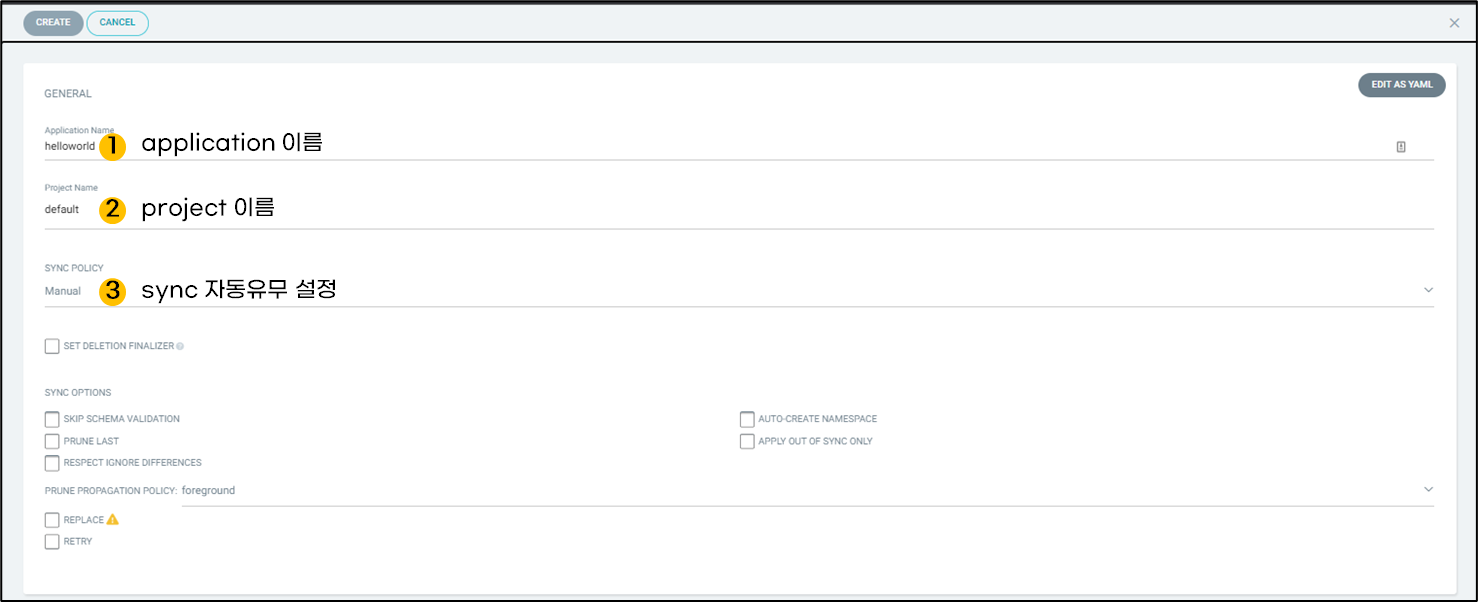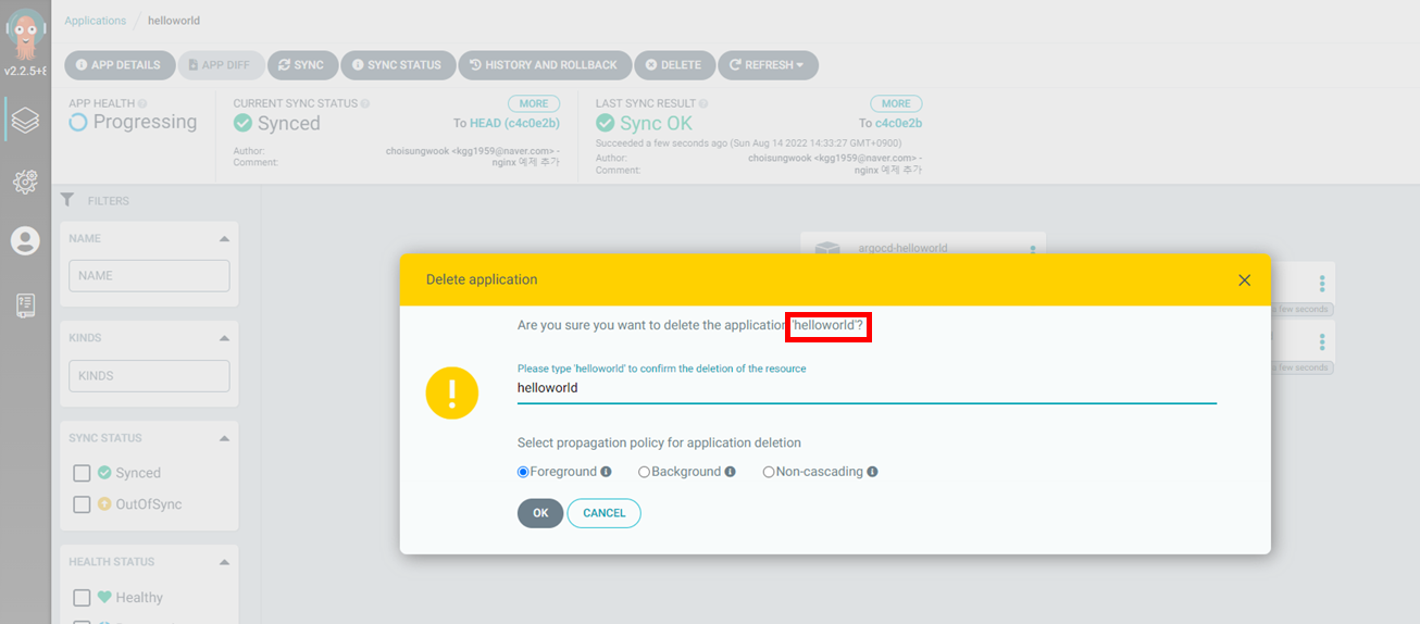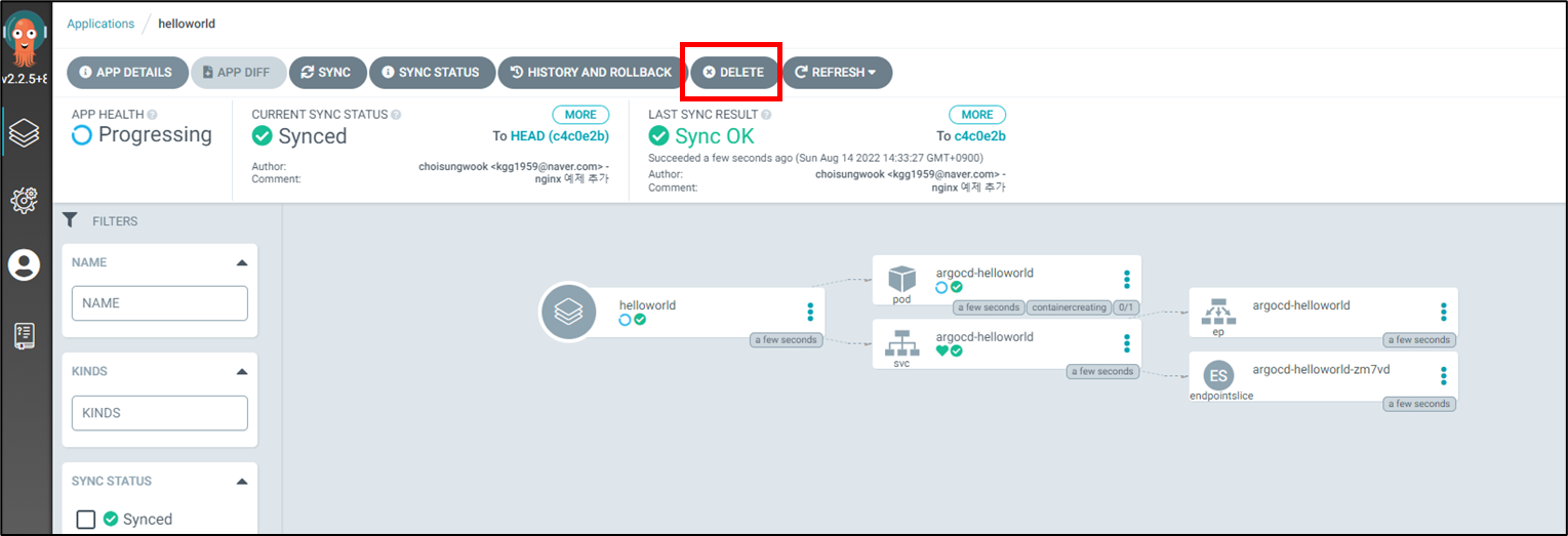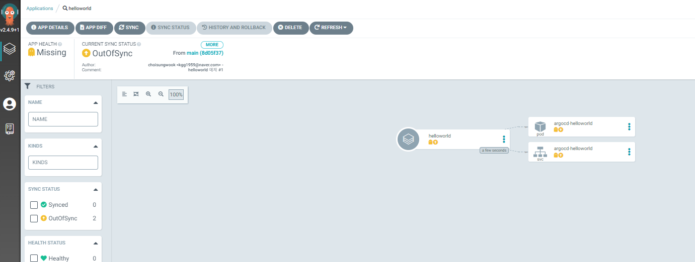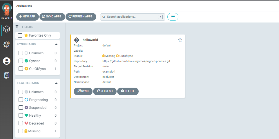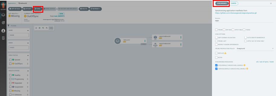 helloworld application이 생성되었습니다. 아직 동기화 작업을 하지 않아 노란색으로 표시됩니다. 생성 단계 ③과정에서 수동(Manual)을 선택했기 때문에 저희가 직접 동기화를 해야합니다.
