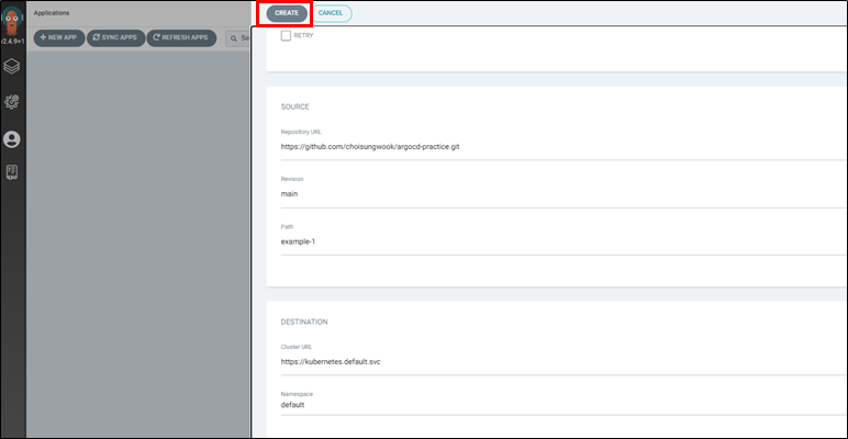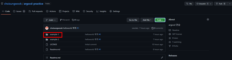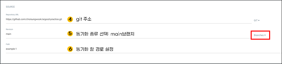 ArgoCD가 동기화 할 git정보를 선택합니다. 제 github repo의 main브랜치를 사용했습니다. helloworld 예제에 사용할 폴더는 example-1입니다.