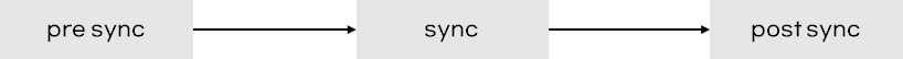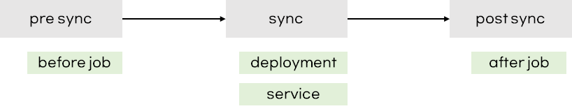 ArgocD sync과정 순서를 phase라고 부르며 3단계(pre sync, sync, post sync)로 진행됩니다. 지금까지 실습했던 예제들은 모드 sync단계에 속합니다. pre-sync와 post sync는 annotations필드에 설정하여 사용할 수 있습니다.