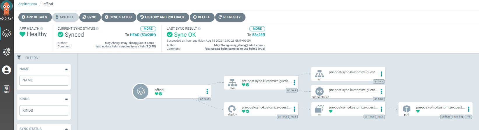 application을 생성 후 sync하면 아래 그림과 같이 잘 동기화됩니다.