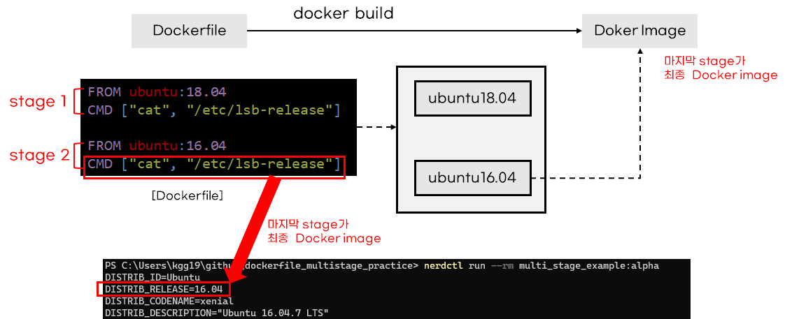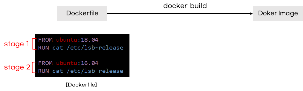 아래 예제는 우분투 정보를 출력하는 Dockerfile입니다. 우분투18, 우분투16버전 정보를 출력하지만, 가장 마지막에 실행된 우분투16버전 출력이 도커이미지로 생성됩니다.
