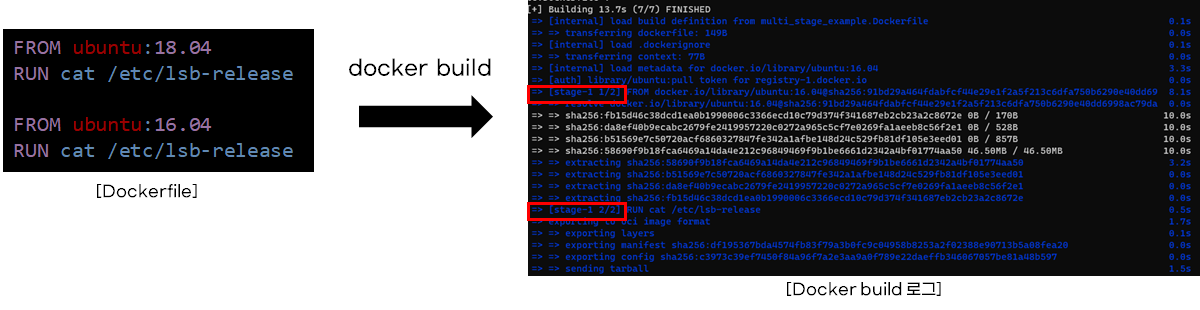 위 예제를 Docker build 실행하면, docker build로그에서 stage가 출력됩니다. stage가 2개이므로 2개의 작업영역이 분리되었습니다.