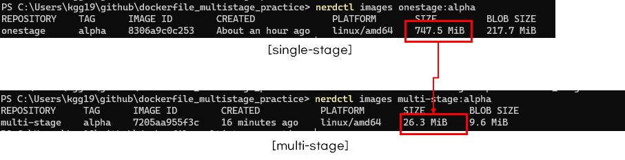 아래 예제는 Multi Stage를 사용했을 경우 도커 이미지 크기가 얼마나 줄었는지 보여주는 예입니다.