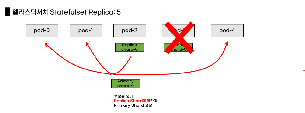 쿠버네티스 Replica를 줄이는 상황이고 가정해봅시다. Replica를 5개에서 3개로 줄입겁니다. 우연히 Primary Shard와 Replica Shard가 종료되는 pod에 있으면 어떻게 될까요?