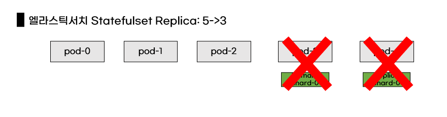 쿠버네티스 Replica를 줄이는 상황이고 가정해봅시다. Replica를 5개에서 3개로 줄입겁니다. 우연히 Primary Shard와 Replica Shard가 종료되는 pod에 있으면 어떻게 될까요?