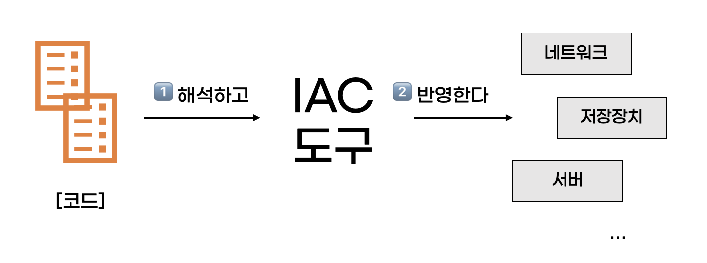코드로 인프라를 관리한다는 말이 무엇일까요? 사용자는 생성/수정/삭제하고 싶은 인프라 자원을 코드로 작성합니다. 그리고 사용자가 IAC도구를 실행하면, IAC도구가 코드를 해석해석 인프라 자원을 반영시킵니다.