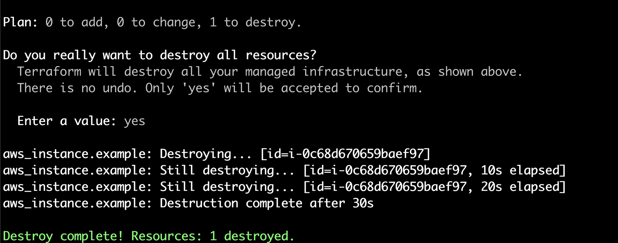 사용자 동의화면에 yes를 입력하면 코드에 설정된 인프라가 삭제됩니다.