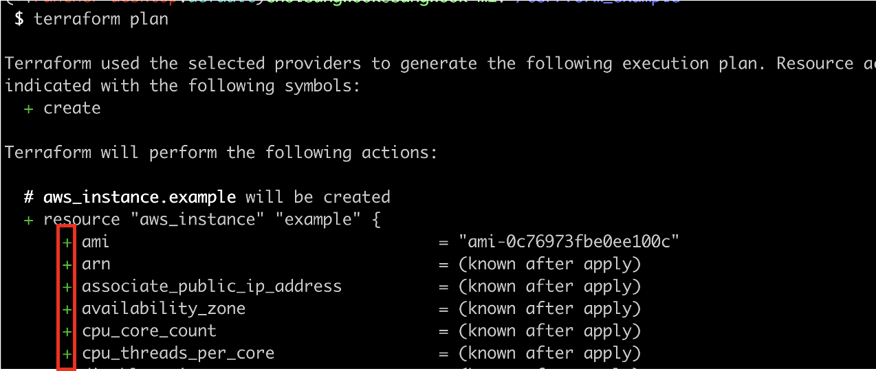 코드를 바로 인프라로 반영하기 전에 terraform plan이라는 명령어로 예상결과를 확인할 수 있습니다. 실수로 설정하면 안되는 것들을 미리 확인하여 수정할 수 있습니다. 새로 추가되는 aws리소스는 “+”로 표시해줍니다.