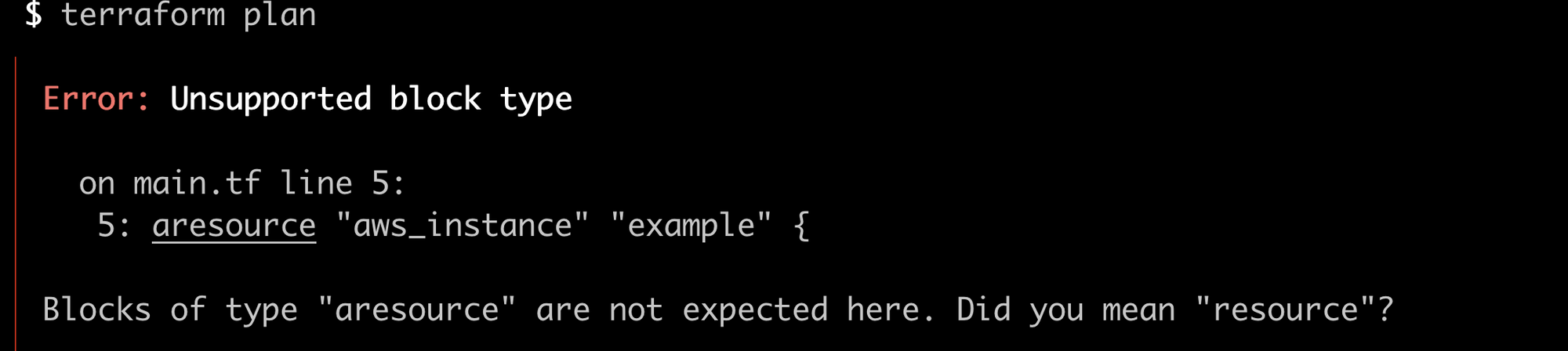 또한, lint기능을 지원하여 테라폼 문법을 잘못 입력했거나 지원하지 않는 문법을 설정을 미리 확인할 수 있습니다. 아래 예제는 일부로 오타를 입력하고 terraform plan을 실행한 결과입니다. 오타를 인식하고 어디서 틀렸는지 확인시켜주네요.