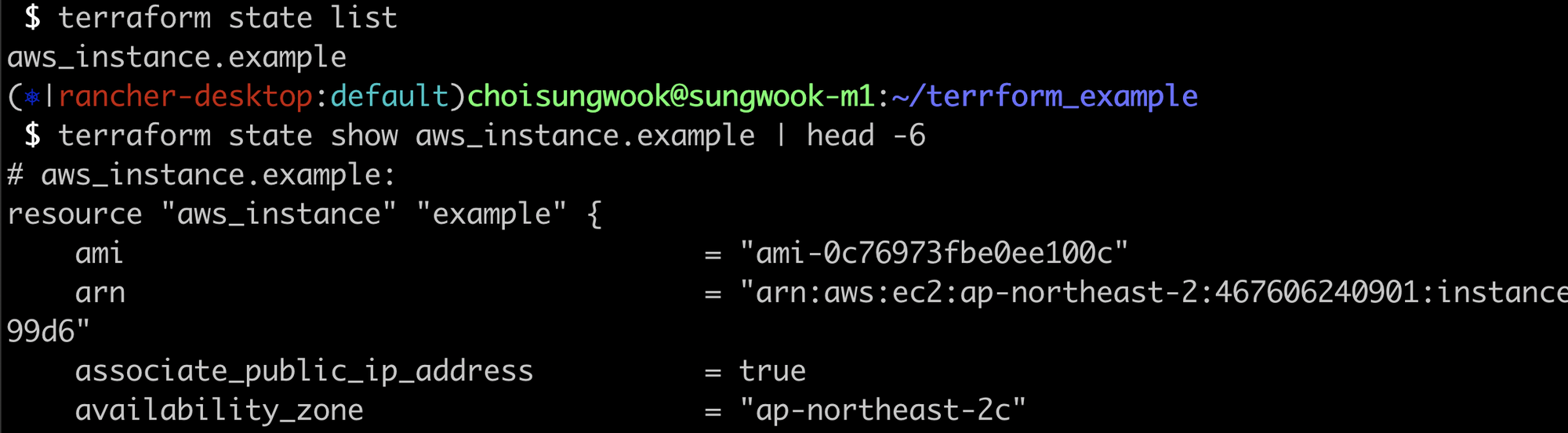 상태를 특정하여 보고 싶다면 terraform state show명령어로 확인할 수 있습니다. 상태파일은 코드가 인프라이 반영되고 proivder에 배포된 실제 값을 저장합니다. 예를 들어 EC2 Instance가 어디 availability zone에 대한 값이 상태파일에 있습니다.