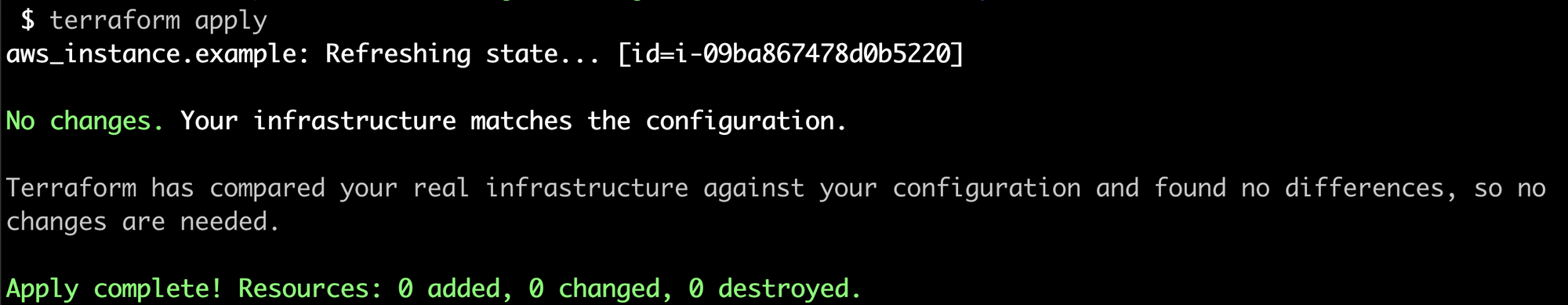 [aws EC2 instace 생성 예제]에서 terraform apply를 한 후, 다시 terraform apply를 해보세요. 첫 번째 terraform apply를 한 직후 인프라에 반영한 상태가 상태파일로 저장됩니다. 그리고 곧바로 terraform apply를 하면 “No change”라는 메세지가 뜨면서 인프라 반영 작업이 중단됩니다.
