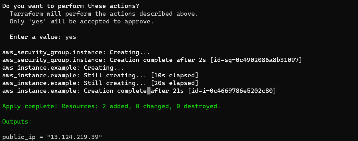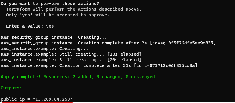 terraform apply명령어를 실행하여 코드를 aws에 반영합니다. 반영이 성공하면 마지막에 output에 설정한 public_ip가 출력됩니다.