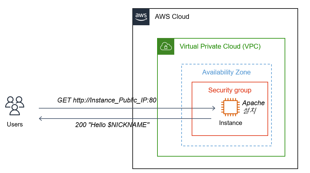 EC2 Instance에 Apache 실행합니다. 외부에서 Apache에 접속하면 NICKNAME을 리턴합니다.