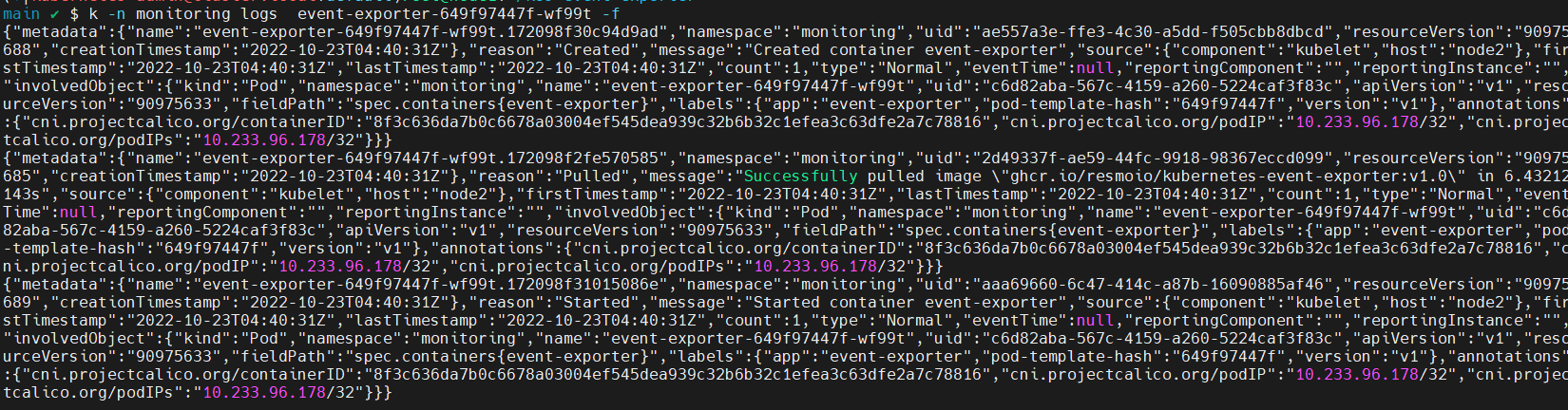 pod 로그를 조회하면 kubectl event로그가 보입니다. event로그를 영구저장하려면 agent와 저장소가 필요합니다.
