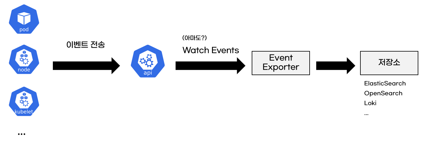 쿠버네티스 이벤트를 전체시간을 조회하기 위한 오픈소스가 여러개 있습니다. 그 중 하나가 Event Exporter(프로메테우스 Exporter가 아님)입니다. Event Exporter는 kube api-server에 event를 watch하여 쿠버네티스 이벤트를 조회합니다. 그리고 조회한 이벤트를 영구저장하기 위해 저장소에 전송합니다. 저장소는 ElasticSearch, Loki 등을 사용합니다.