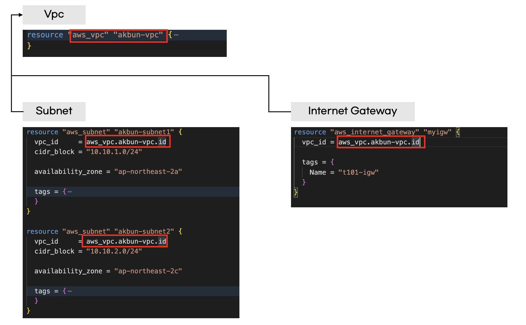 테라폼으로 vpc, subnet, internet gateway생성은 리소스 참조만 잘 설정해주면 됩니다. subnet과 internet gateway가 vpc가 필요하므로 vpc.id를 참조하면 됩니다.