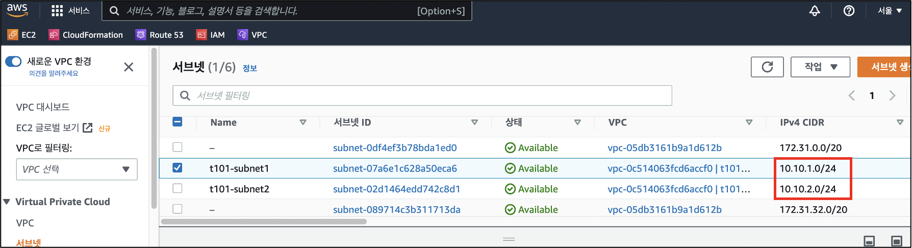 aws 대시보드에서 vpc cidr이 10.10.1.0/24인지 확인합니다.