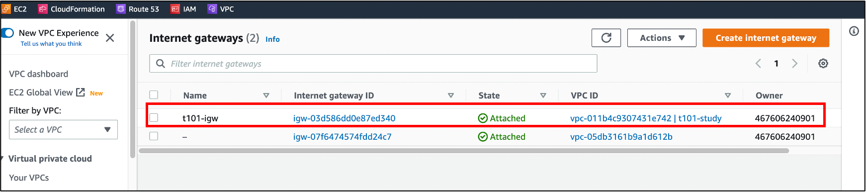 - internet gateway 1개를 생성합니다.
