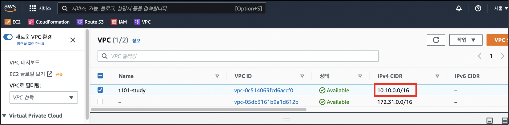 aws 대시보드에서 vpc cidr이 10.10.1.0/24인지 확인합니다.