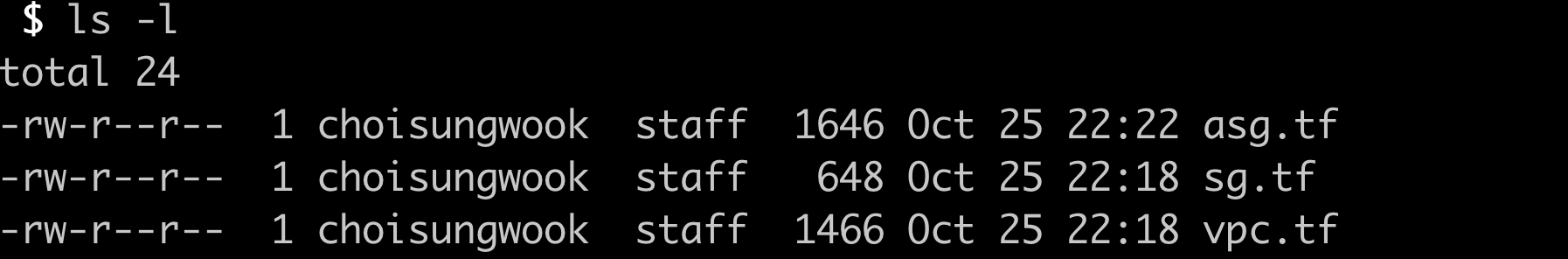 tf확장자 파일은 terraform plan 또는 terraform apply명령어를 실행할 때 인식됩니다 그러므로 역할별로 tf파일을 나누고 코드를 작성할 수 있습니다. 아래 예는 aws vpc, security group, auto scaling group 코드를 나누어서 작성했습니다.