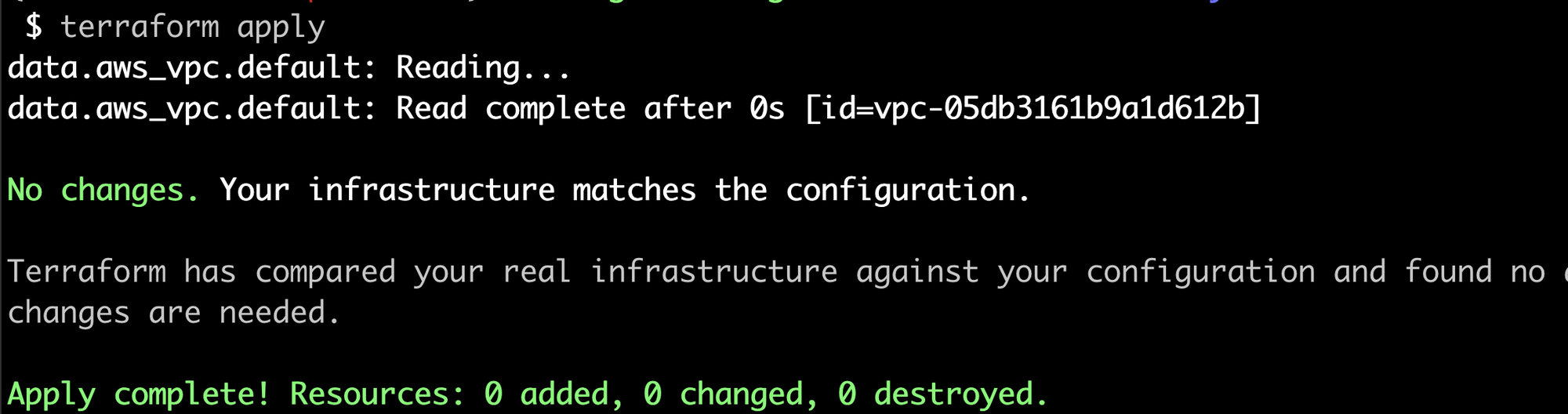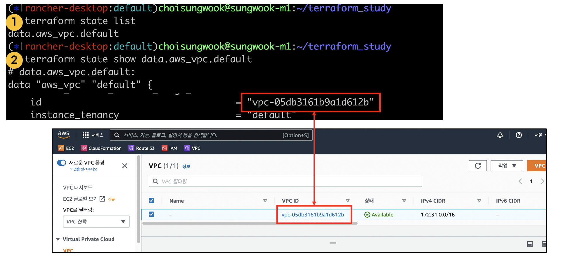 상태를 조회하면 aws_vpc상태가 보입니다. terraform state show명령어로 상태를 자세히보면, aws default vpc id와 상태에 저장된 id와 동일한 것을 알 수 있습니다.