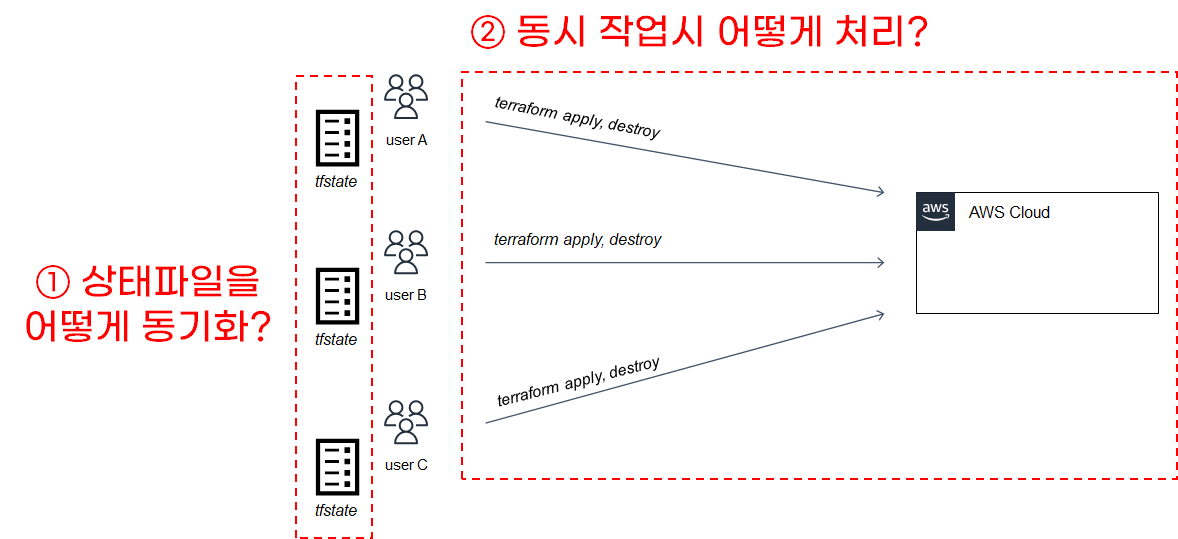 상태파일은 테라폼코드가 인프라에 반영된 상태를 저장하고 있습니다. 그리고 인프라에 영향을 주는 terrform명령어를 실행하면, 테라폼 코드와 상태파일을 비교하여 인프라에 반영합니다. 그러므로 상태파일이 동기화되어 있지 않으면 다른 사람이 작업한 내용이 사라질 수 있거나 예상치 못한 결과를 초래할 수 있습니다.