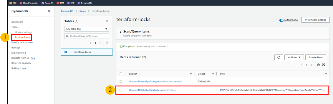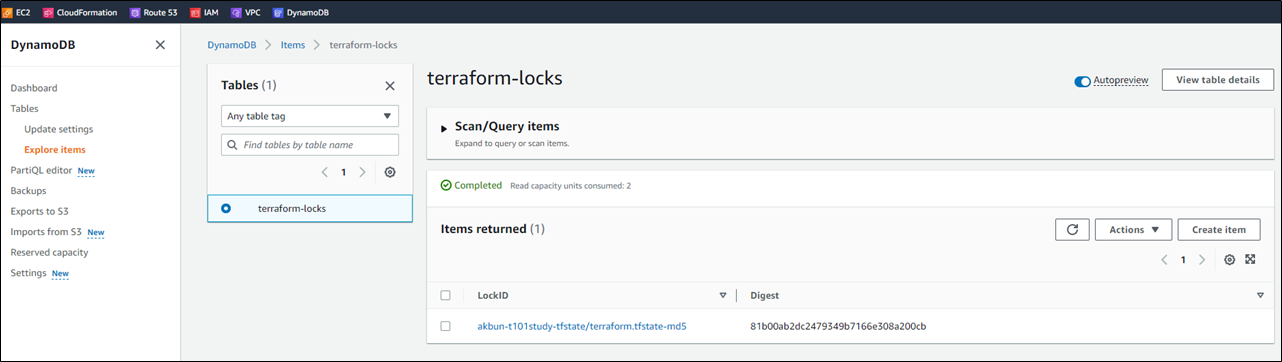 dynamodb에 저장된 item목록을 보면 lock파일이 생성되었습니다. 테라폼 작업을 동시에 하지 못하도록 lock파일이 생성된겁니다.