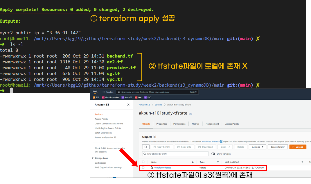 terraform apply명령어 실행이 성공하면 tfstate파일이 로컬에 존재하지 않습니다. backend를 s3로 설정했기 때문에 s3에 tfstate파일이 존재합니다.