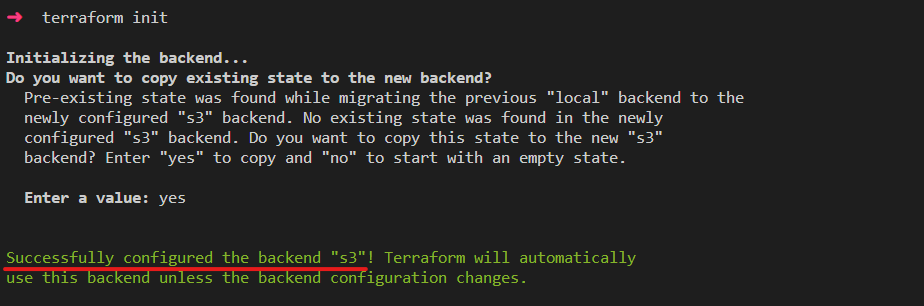 테라폼 backend를 적용하기 위해 terraform init명령어를 실행합니다.