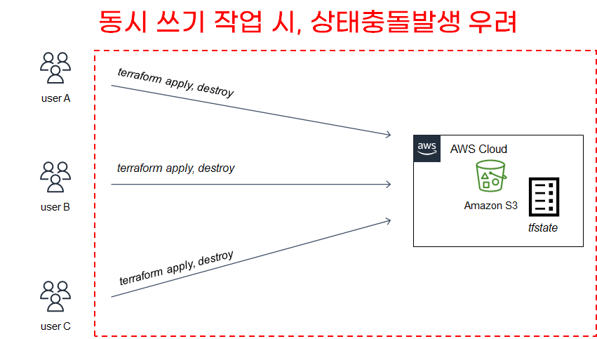원격 backend를 어떤 거를 사용하느냐에 따라 locking작업이 달라지는데요. 아쉽게도 s3는 동시 쓰기 작업을 완벽히 막아주지 않는 것 같습니다.