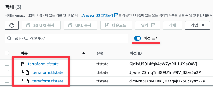 s3버전 옵션을 활성화 했다면 state파일을 백업할 수 있습니다.