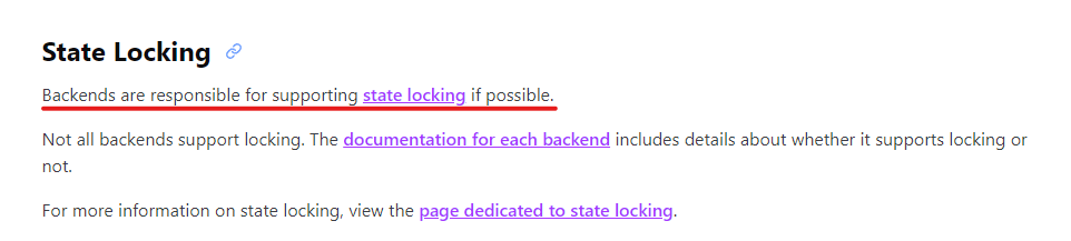 테라폼 공식문서(https://developer.hashicorp.com/terraform/language/state/backends#state-locking)를 보면 backend를 사용하면 lokcing에 대한 책임이 필요하다고 설명합니다.