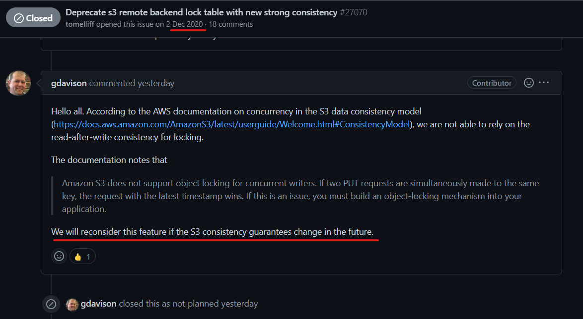 테라폼 Issuse에서도 s3를 backend는 locking을 지원하지 않아 보조도구를 여전히 써야한다고 언급하고 있습니다.