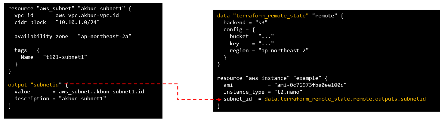 data block참조 문법을 사용하여 원격 상태 값을 사용할 수 있습니다. outputs필드를 꼭 사용해야 합니다.